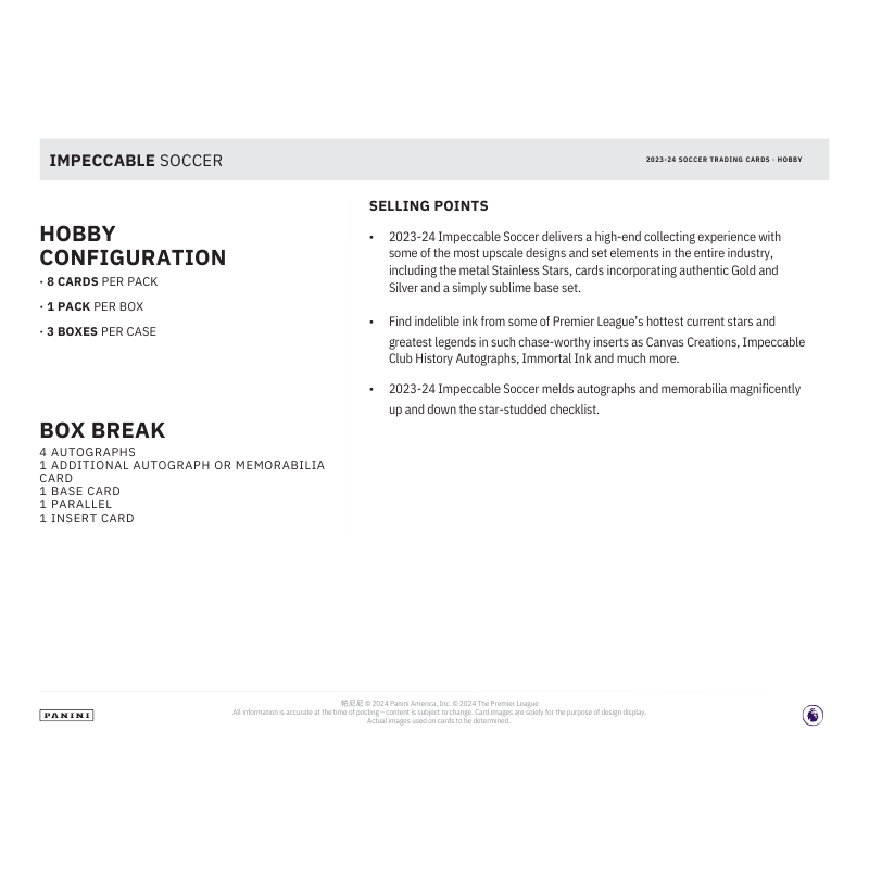- 2023-24 Impeccable Soccer delivers a high-end collecting experience with some of the most upscale designs and set elements in the entire industry, including the metal Stainless Stars, cards incorporating authentic Gold and Silver and a simply sublime base set.