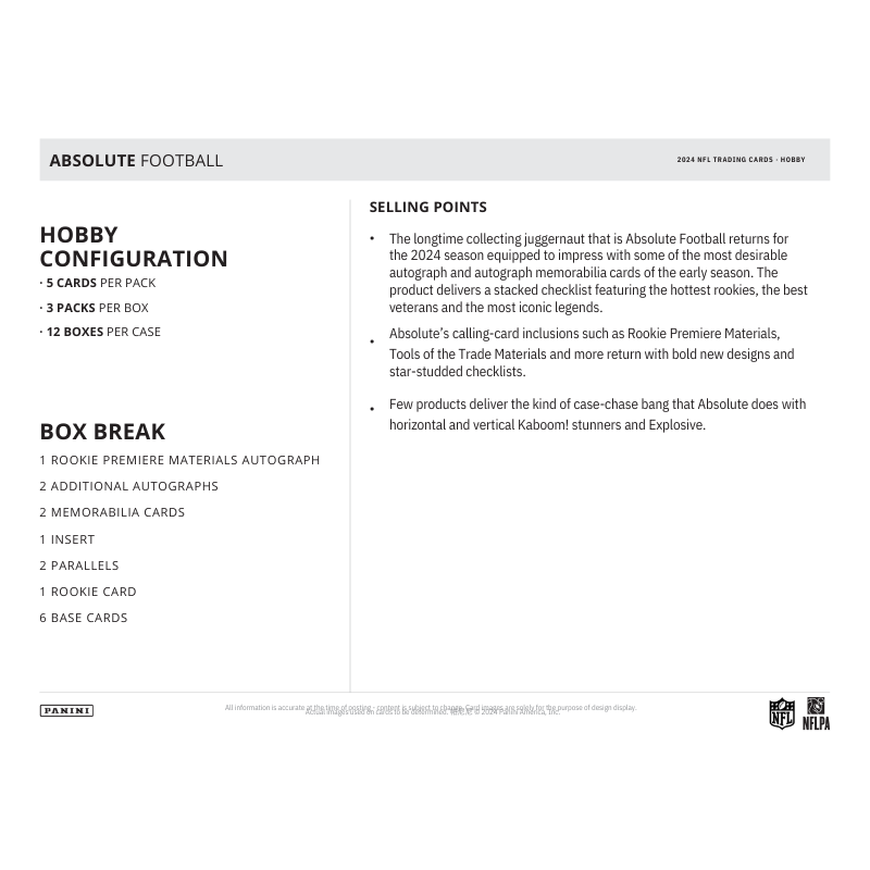 • The longtime collecting juggernaut that is Absolute Football returns for the 2024 season equipped to impress with some of the most desirable autograph and autograph memorabilia cards of the early season. The product delivers a stacked checklist featuring the hottest rookies, the best veterans and the most iconic legends.